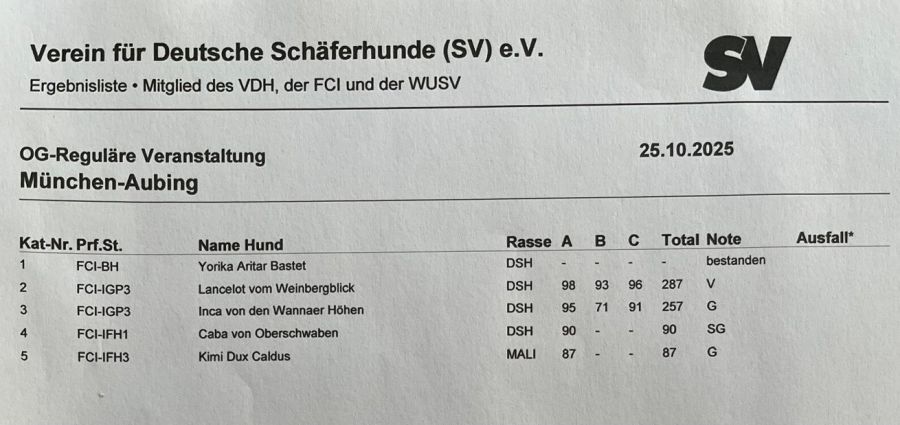 | IGP3 | Richard Dobitsch | Yola vom Wolfsdreieck | 100 | 95 | 90 | 285 Pkte SG |